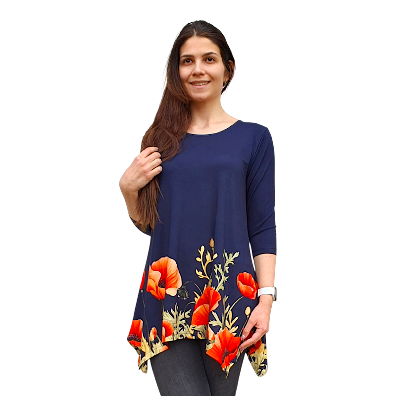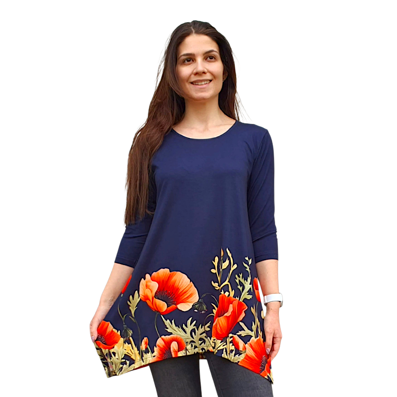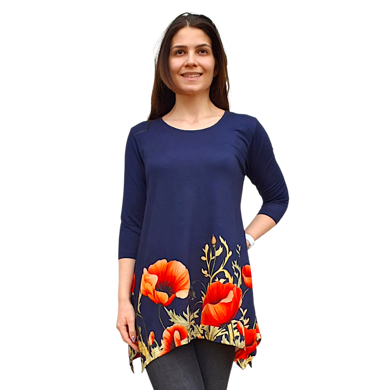 Асиметрична туника с 3/4 ръкав и елегантен десен. Комфортна, забелязваща се, идеална за ежедневието и небрежно елегантна визия.