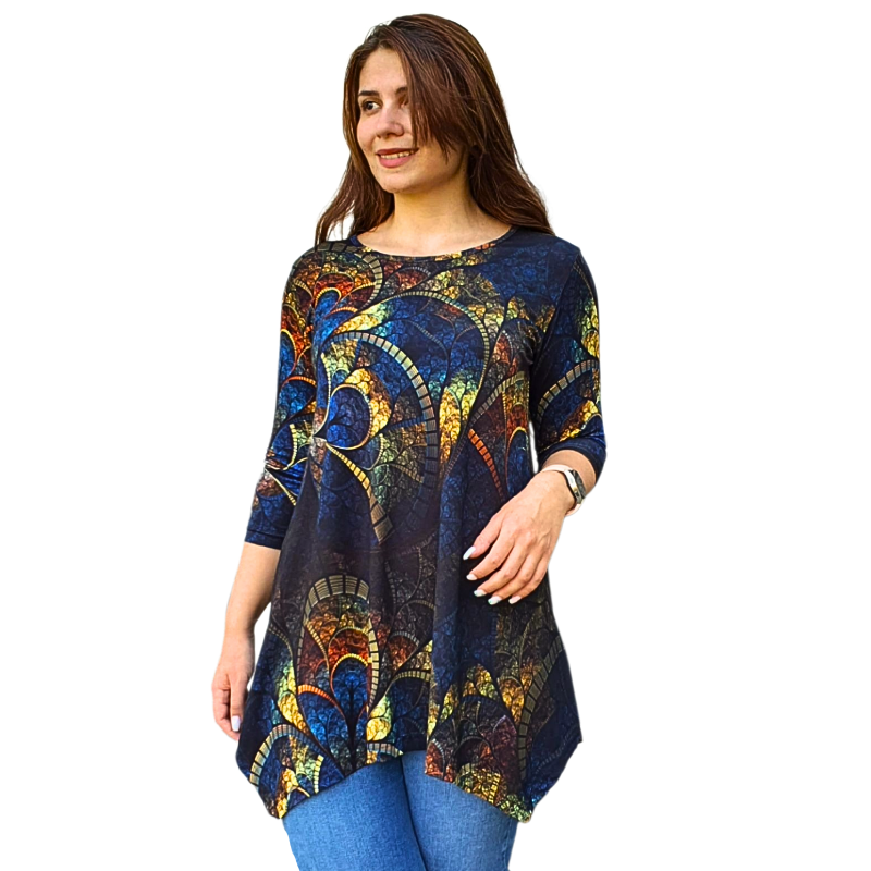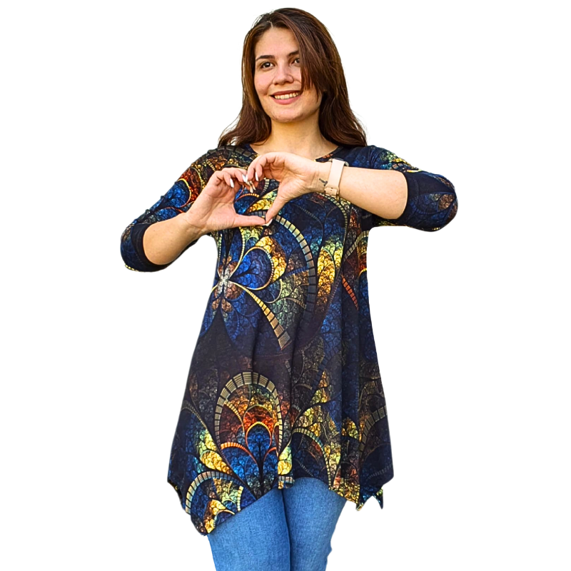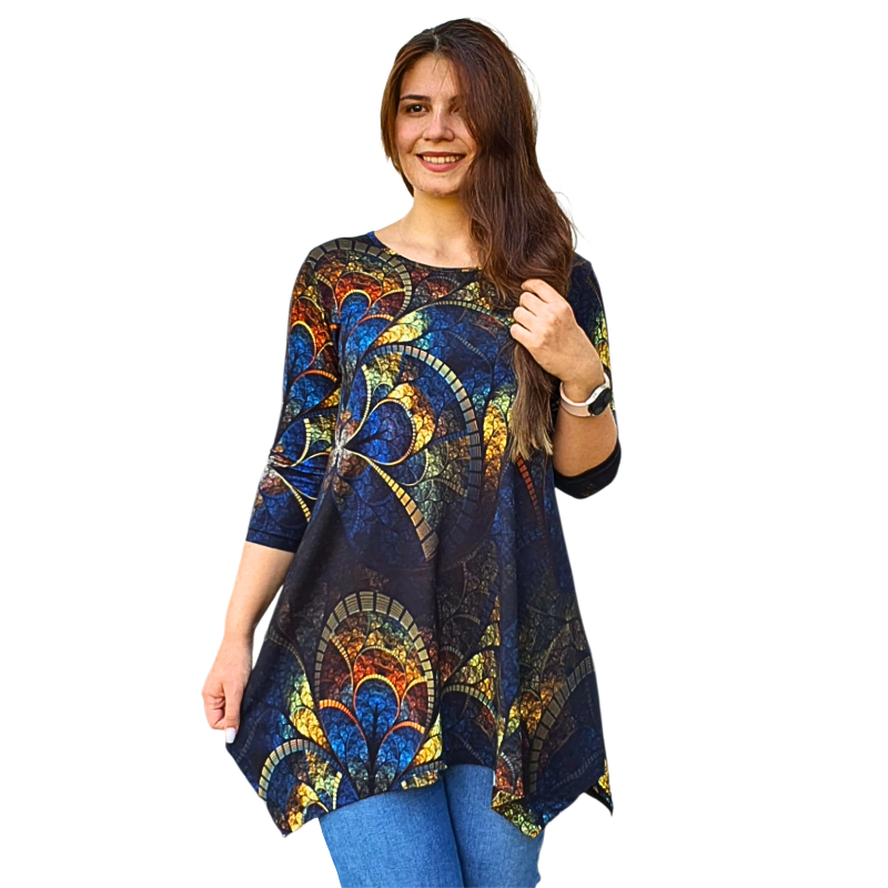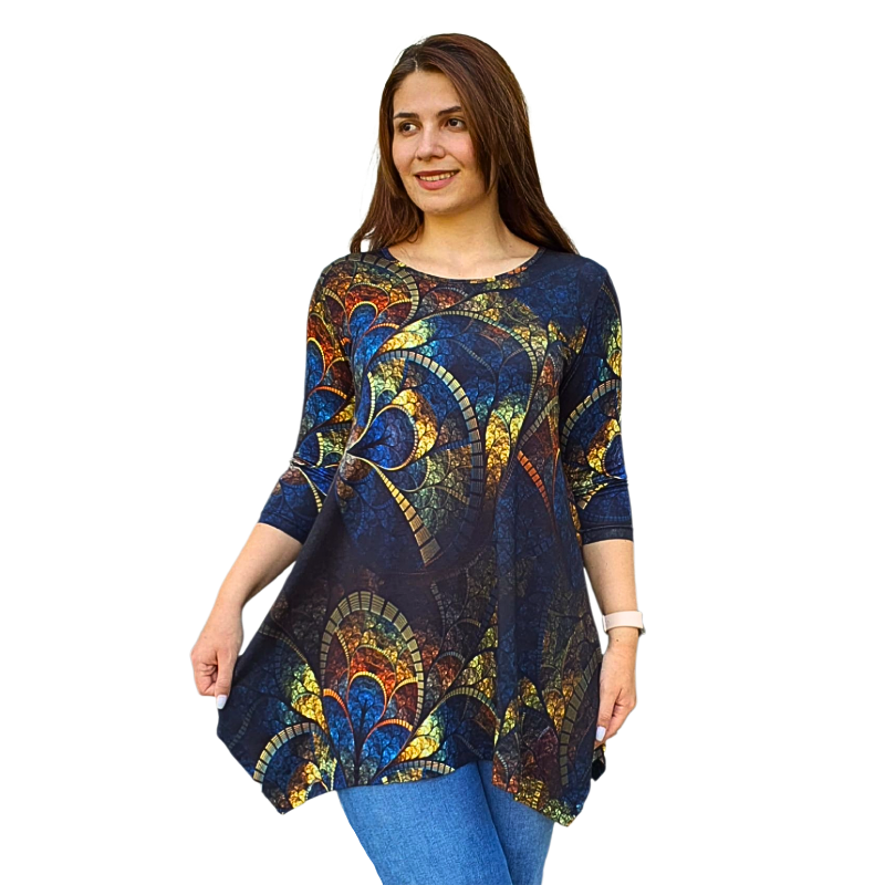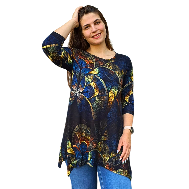 Асиметрична туника с къс ръкав и елегантен десен „Драконово цвете“. Комфортна, забелязваща се, идеална за ежедневието и небрежно елегантна визия.