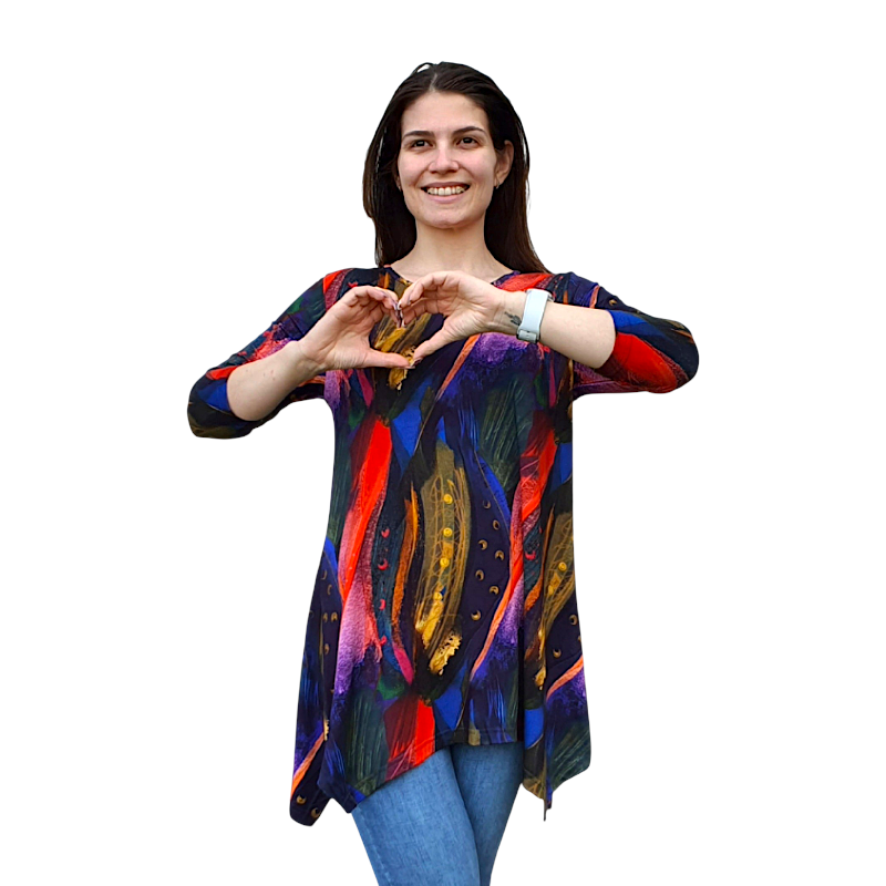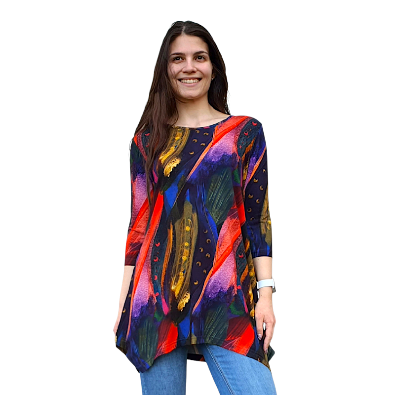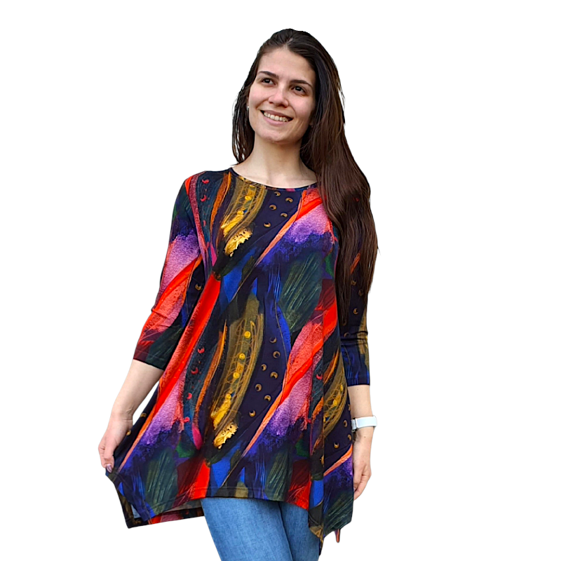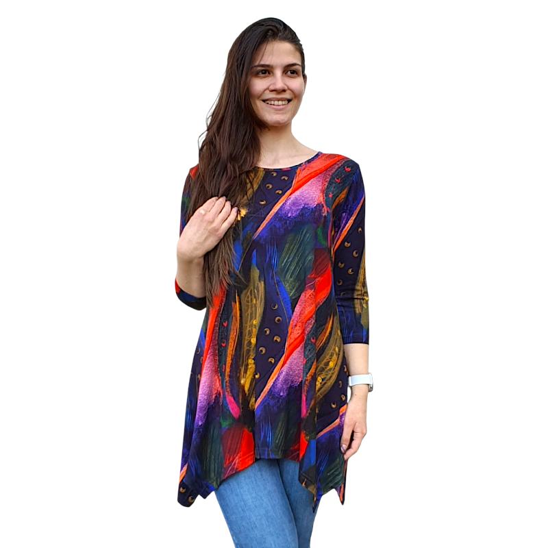 Асиметрична туника с 3/4 ръкав и елегантен десен. Комфортна, забелязваща се, идеална за ежедневието и небрежно елегантна визия.
