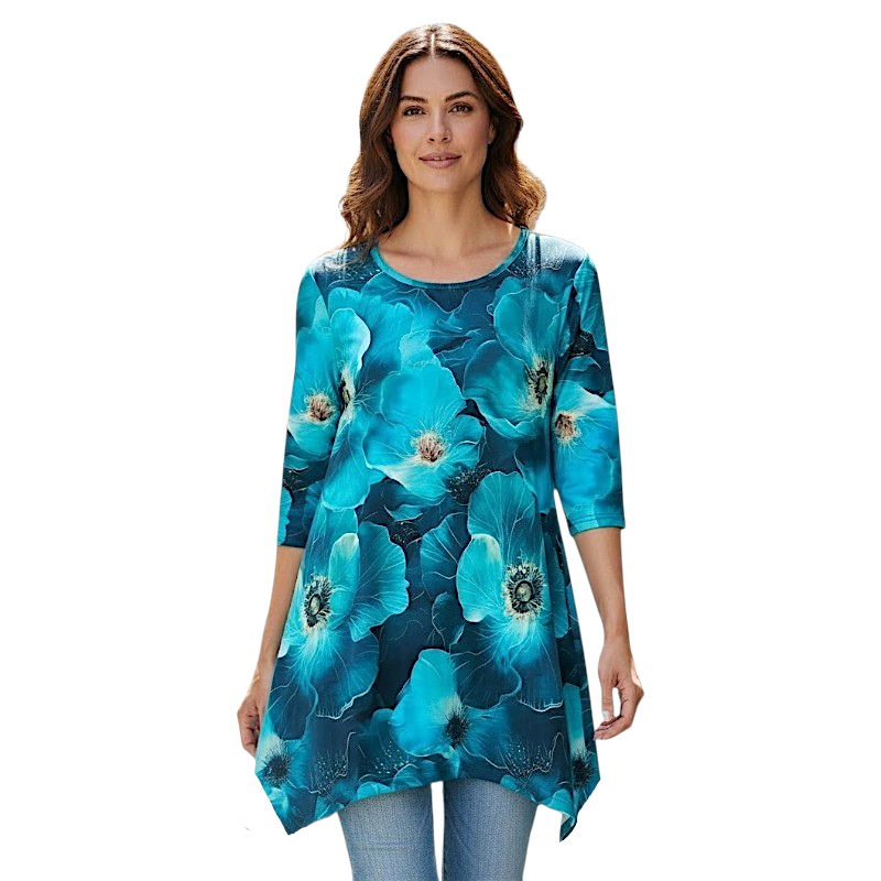 Асиметрична туника МИЛЕНА с 3/4 ръкав и прекрасен десен „Нежни цветя в тюркоаз“. Свежа, комфортна и стилна, идеална за ежедневието и небрежно елегантна визия.