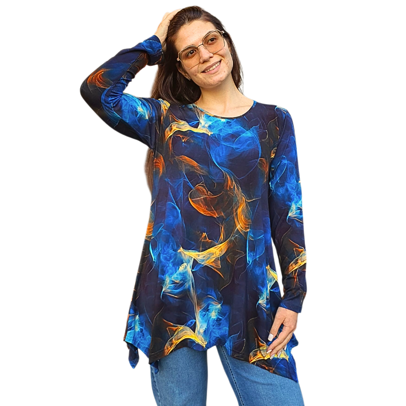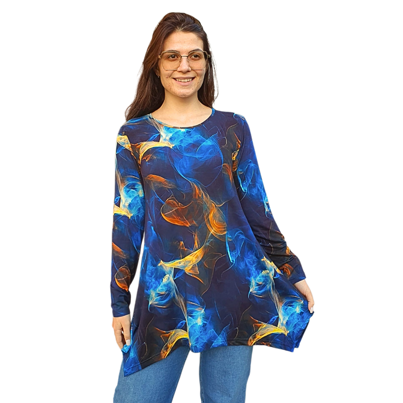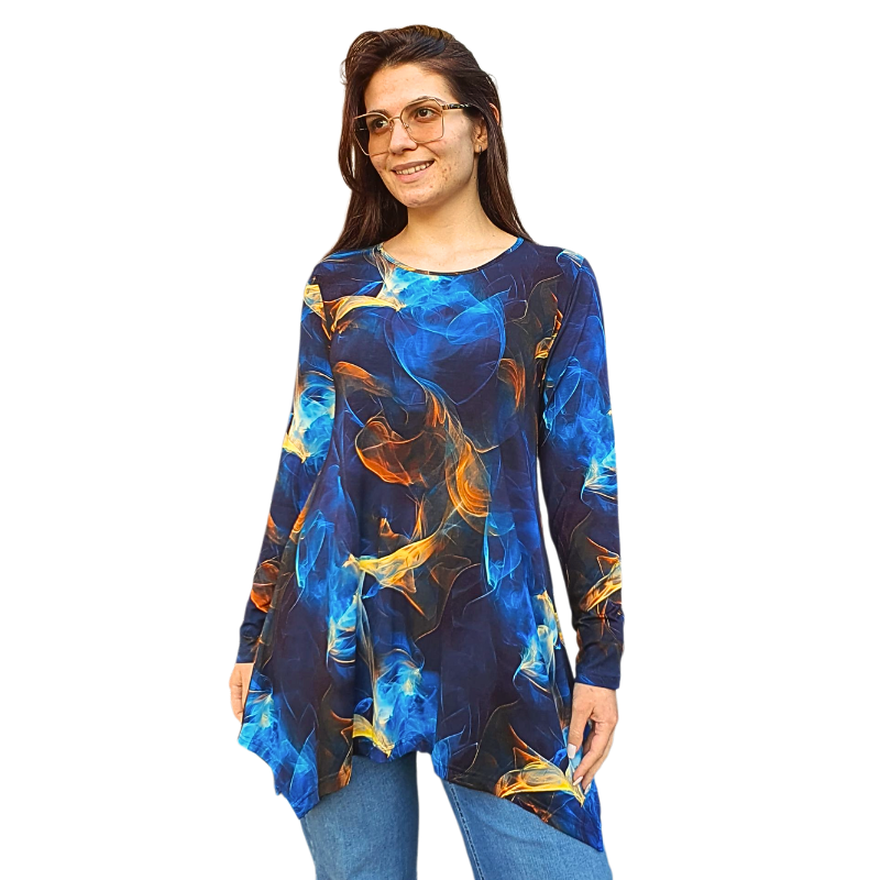 Асиметрична туника с дълъг ръкав и елегантен десен. Комфортна, забелязваща се, идеална за ежедневието и небрежно елегантна визия.