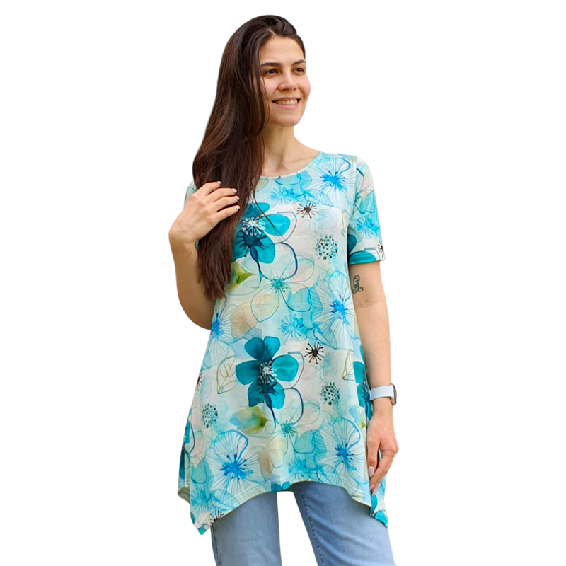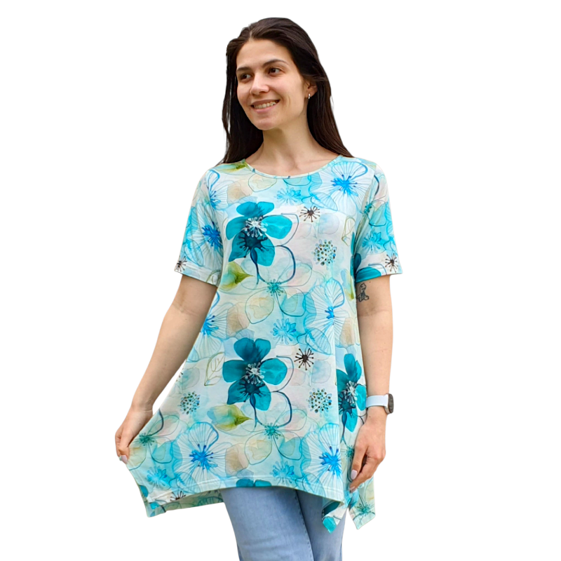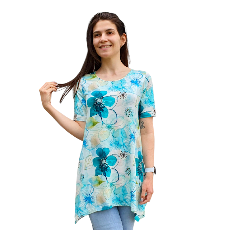 Асиметрична туника с къс ръкав и елегантен десен. Комфортна, забелязваща се, идеална за ежедневието и небрежно елегантна визия.