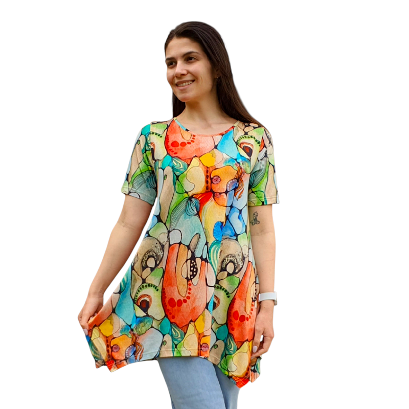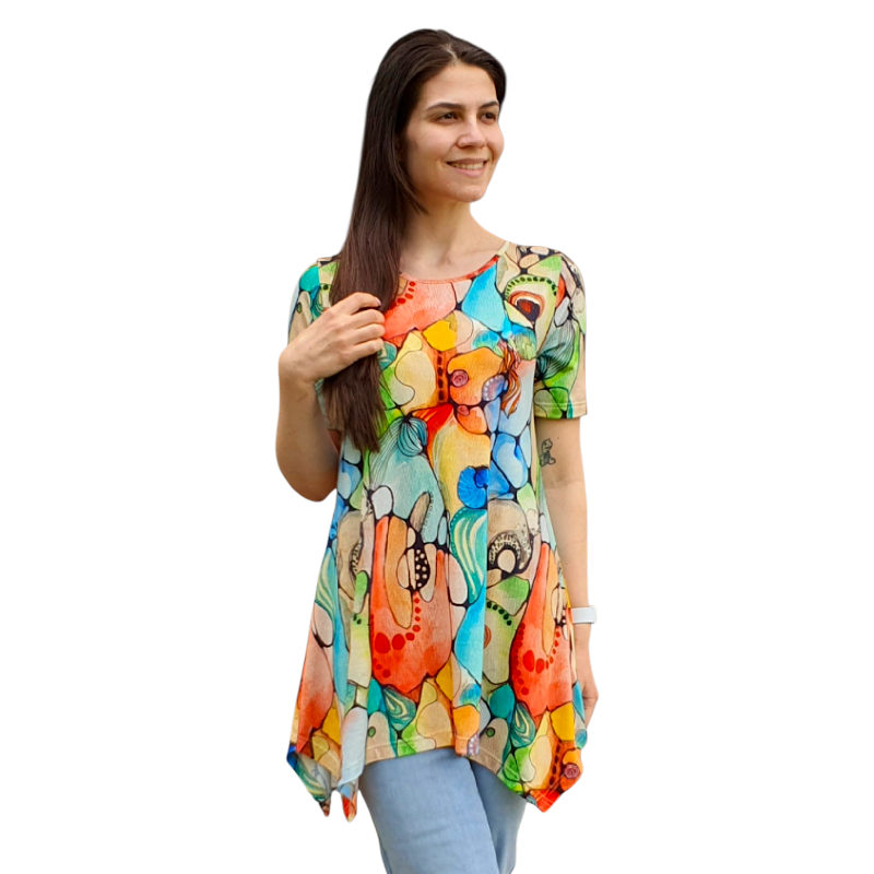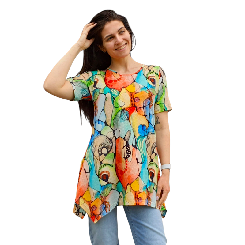 Асиметрична туника с къс ръкав и интересен десен. Комфортна, забелязваща се, идеална за ежедневието и небрежно елегантна визия.