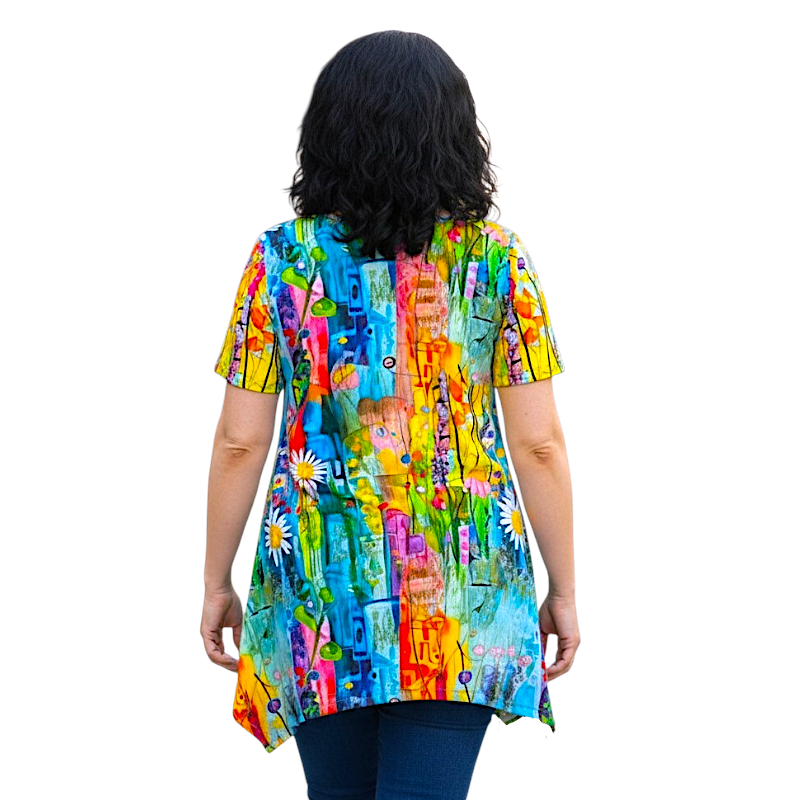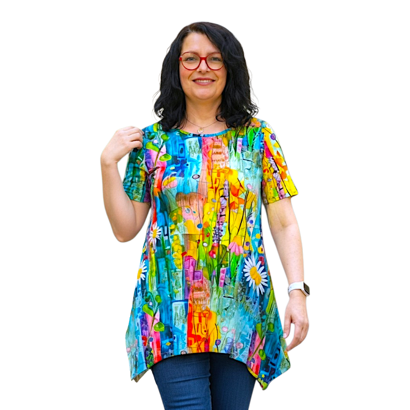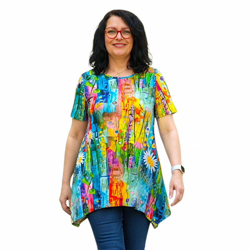 Асиметрична туника с къс ръкав и интересен десен. Комфортна, забелязваща се, идеална за ежедневието и небрежно елегантна визия.