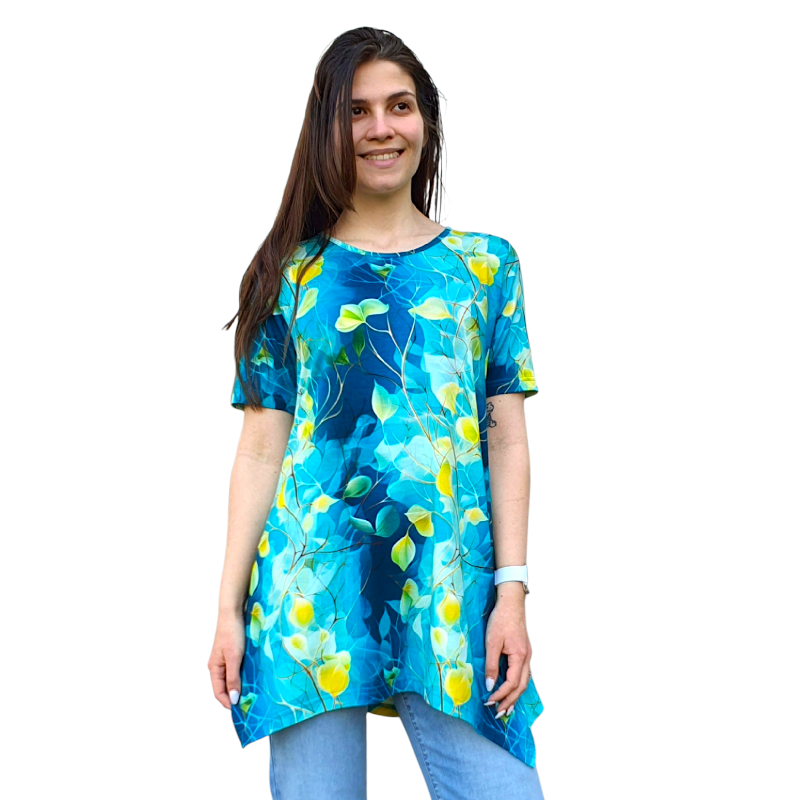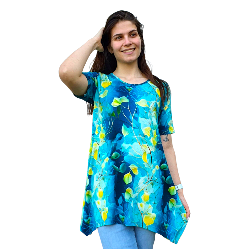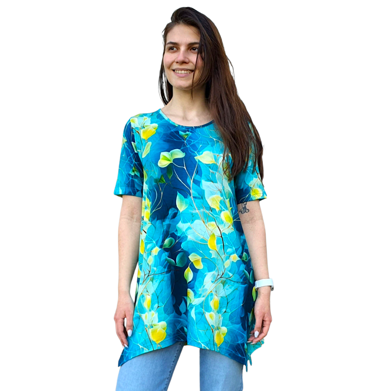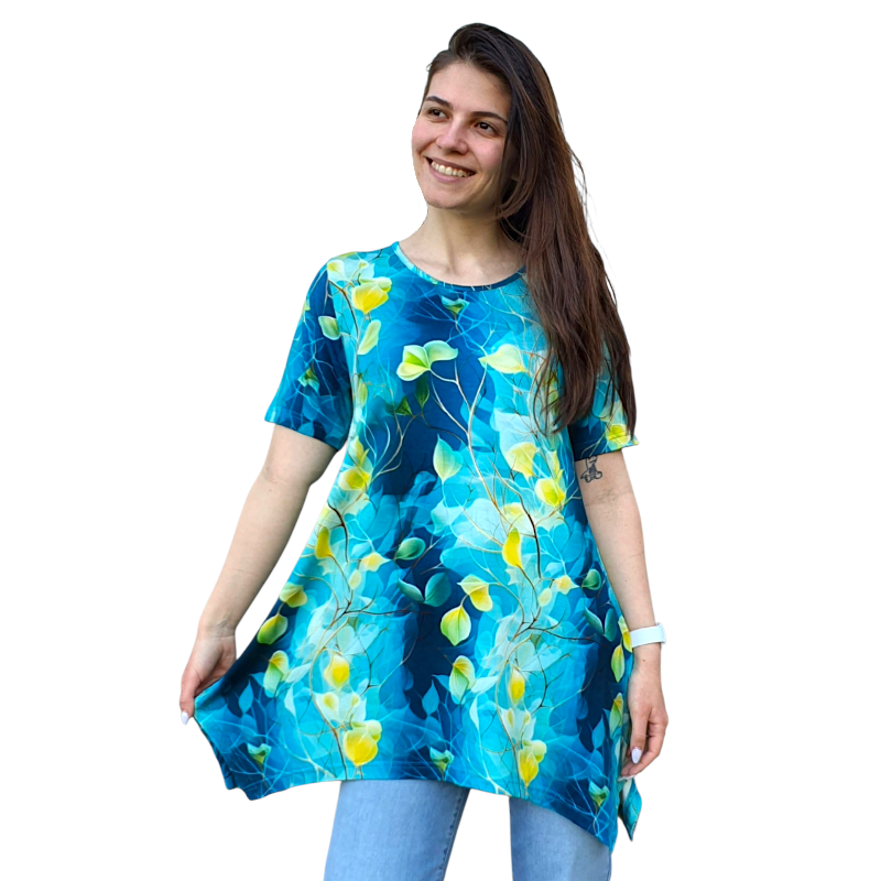 Асиметрична туника с къс ръкав и елегантен десен. Комфортна, забелязваща се, идеална за ежедневието и небрежно елегантна визия.