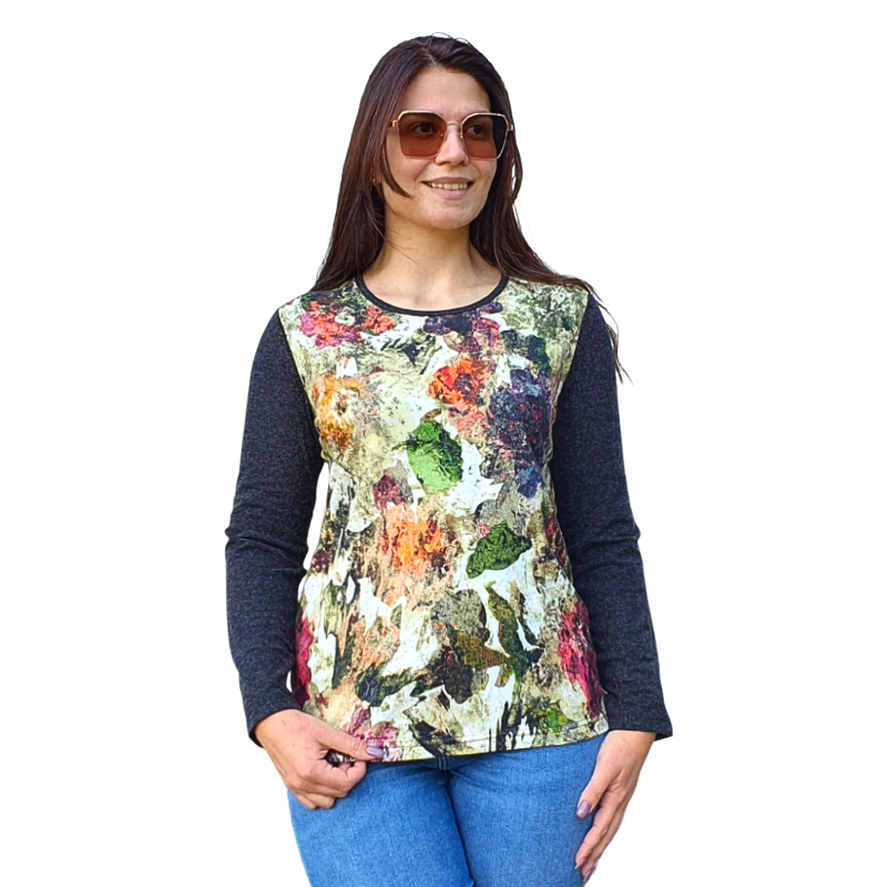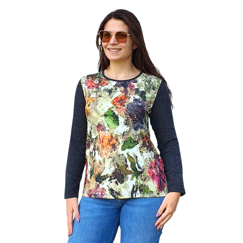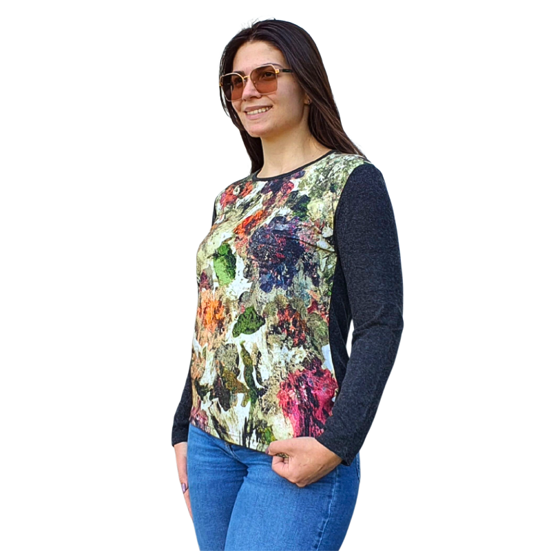 Блуза модел АНЕЛИЯ – ангора, ръкави и гръб в цвят графит. Съчетание от комфорт, стил и уникален дизайн. Характеристики: • Материя:  мека, топла и нежна към кожата • Дизайн: Артистичен принт с мотиви от природата  в топли есенни нюанси • Ръкави: Контрастни тъмни ръкави, които подчертават визията и добавят елегантност • Кройка: Свободна и удобна, подходяща както за ежедневието, така и за по-специални поводи Подходяща за сезон есен-зима • Лесна за съчетаване с дънки, панталони или пола • Изработена с внимание към детайла и качеството