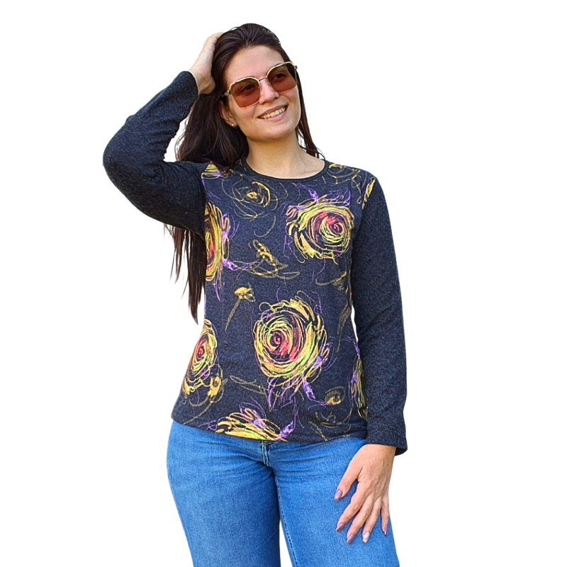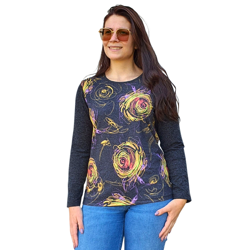 Блуза модел АНЕЛИЯ – ангора, ръкави и гръб в цвят графит. Съчетание от комфорт, стил и уникален дизайн.   Характеристики: • Материя:  мека, топла и нежна към кожата • Дизайн: Артистичен принт с мотиви от природата  в топли есенни нюанси • Ръкави: Контрастни тъмни ръкави, които подчертават визията и добавят елегантност • Кройка: Свободна и удобна, подходяща както за ежедневието, така и за по-специални поводи • Подходяща за сезон есен-зима • Лесна за съчетаване с дънки, панталони или пола • Изработена с внимание към детайла и качеството