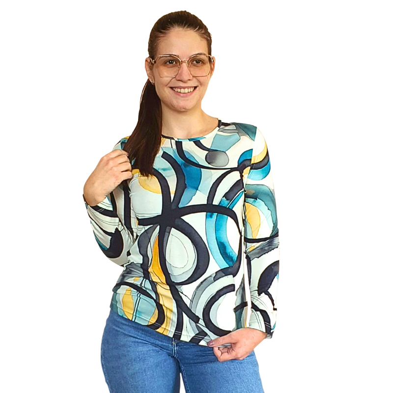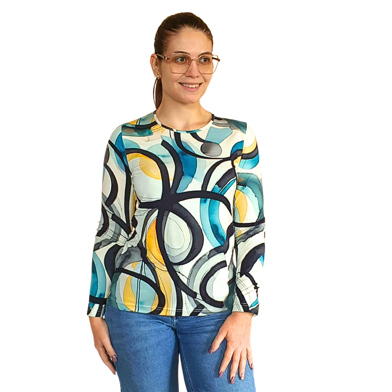 Блуза „Анелия“ – Контрастни линии Цвят, стил и хармония в едно! Блузата „Анелия“ с дълъг ръкав и артистичен десен „Контрастни линии“ е създадена за жената, която обича да изразява себе си чрез дрехите си. Съчетавайки контрастни цветове и форми, този модел носи усещане за баланс, енергия и индивидуалност. ✨ Характеристики: • Модел: Анелия – елегантна, свободна кройка с дълъг ръкав • Десен: Контрастни линии – вдъхновен от динамиката на живота • Материя: Мека и удобна, подходяща за ежедневието и специални поводи • Цвят: Многоцветен – контрастни тонове на кремава основа