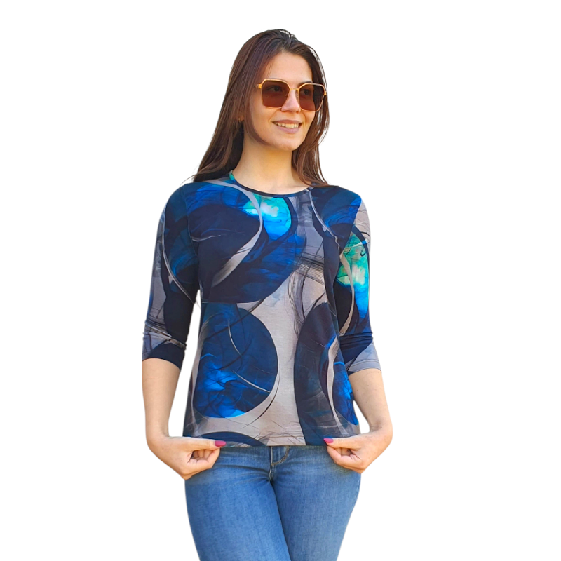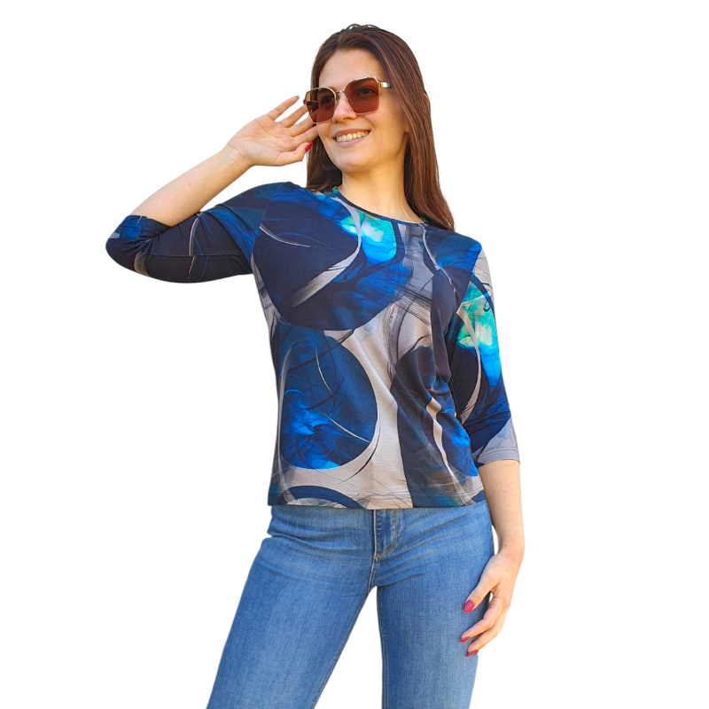 Открийте магията на блуза АНЕЛИЯ – модел, който съчетава комфорт, стил и артистичен дух. Подчертава твоята индивидуалност с изтънчен шик. Характеристики: • Ръкав: ¾  – идеален за преходните сезони и за стилен силует • Оригинален, впечатляващ десен • Материя: Дишаща и приятна на допир – подходяща както за ежедневието, така и за специални поводи • Кройка: Свободна, права – осигурява комфорт и свобода на движение • Подходяща както за офис визия, така и за вечерна разходка • Лесна за съчетаване с дънки, панталони или пола • Придава артистичен акцент на всяка комбинация • Универсален модел, който подчертава индивидуалния стил