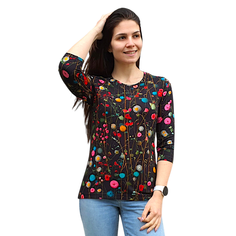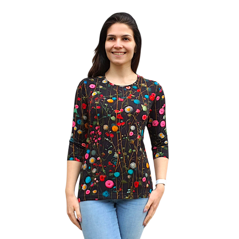 Блуза „Анелия“ с 3/4 ръкав, свободен силует и артистичен десен. Удобна, впечатляваща, подходяща както за ежедневието, така и за по-специален повод.