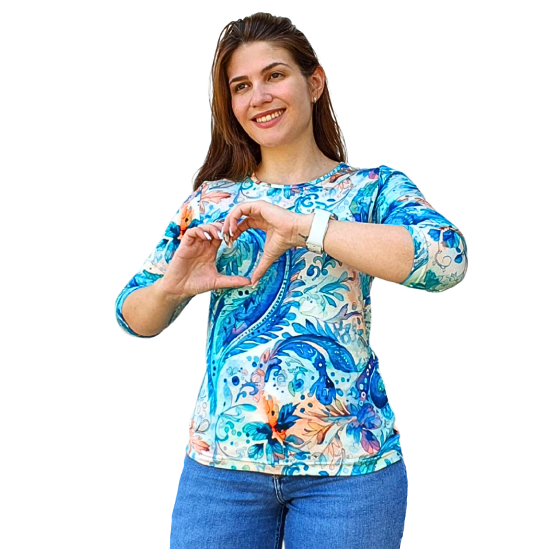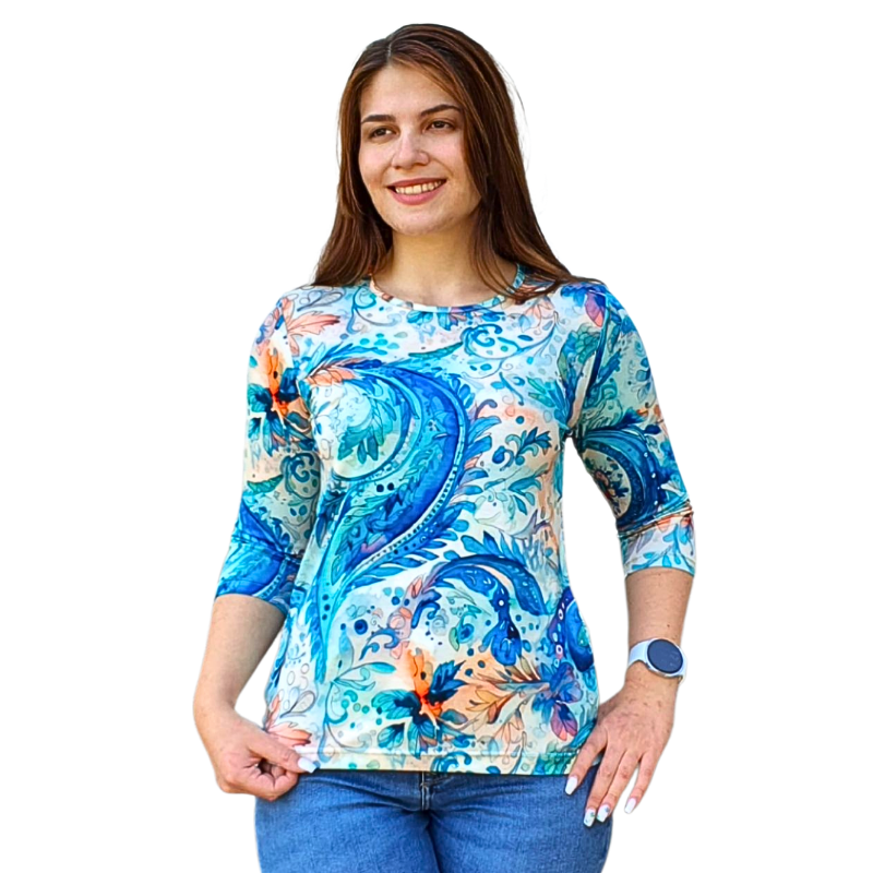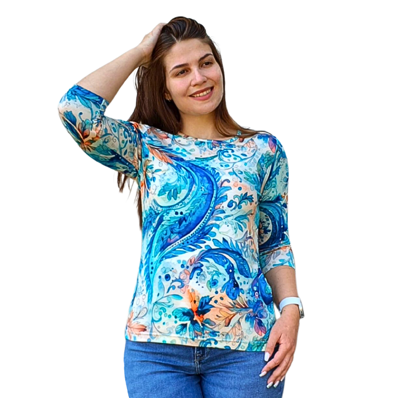 Блуза „Анелия“ – 8206 с 3/4 ръкав, свободен силует и романтичен десен „Нежни орнаменти в светло синьо“. Удобна, женствена и подходяща както за ежедневието, така и за по-специален повод.