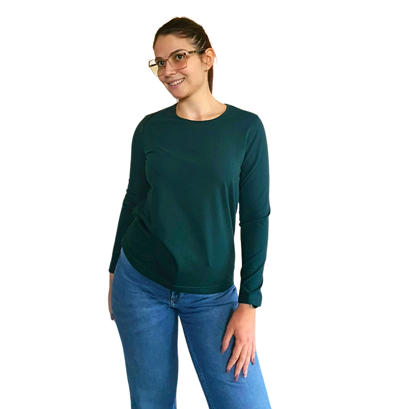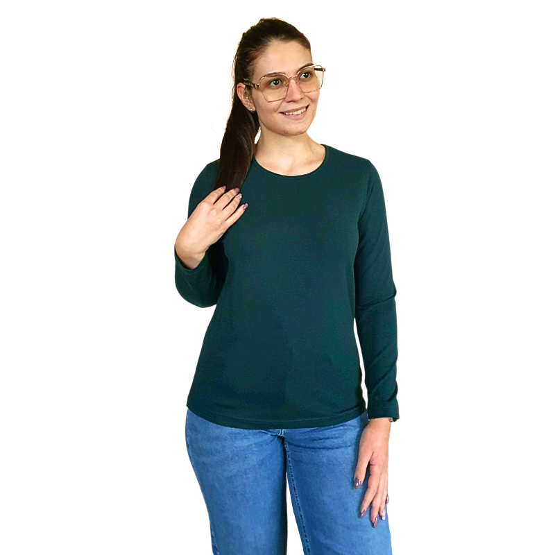 Блуза „Анелия“ с дълъг ръкав, естествена материя – памук/еластан и свободен силует в тъмен, синьо зелен нюанс – петрол