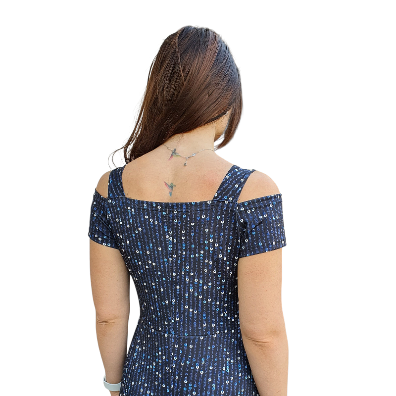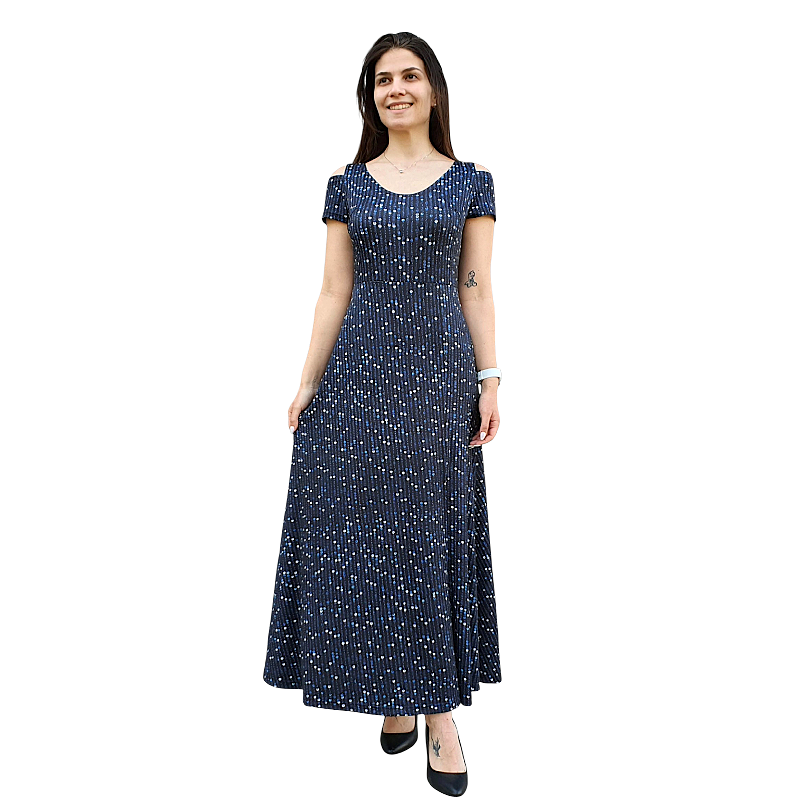 Изключително красива рокля модел Оливия в десен имитиращ блестящи пайети на тъмно син фон – дълга, елегантна рокля с интересна кройка. С голо рамо и цепка. Изработена от мека и еластична материя. Подходяща за романтични разходки и специални поводи.