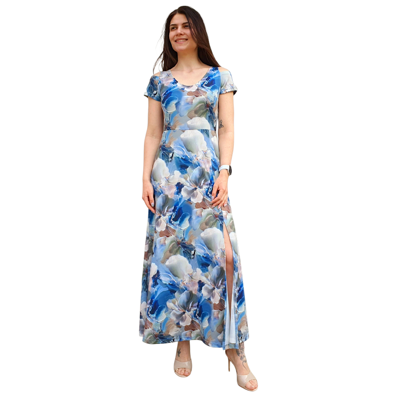 Дълга рокля в интересен десен в синьо и сиво – СИНИ ОРХИДЕИ