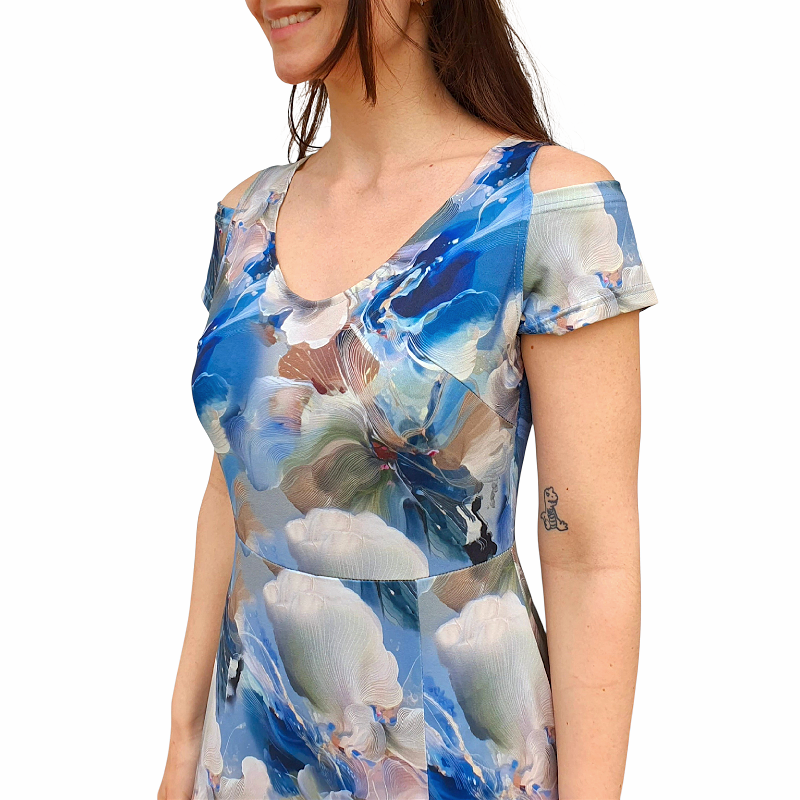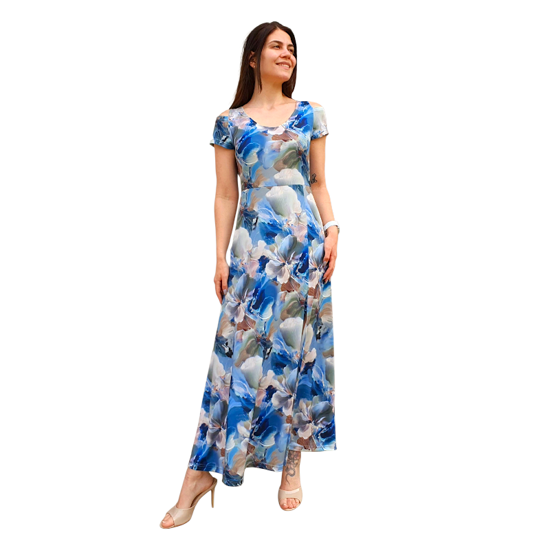 Дълга рокля модел “Оливия”с голо рамо, десен “СИНИ ОРХИДЕИ” – код: 8381