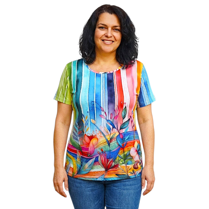 Изключително ведра блуза, с многоцветна щампа, която придава оригинална и свежа визия. Подходяща е за ежедневието, за разходки с приятели, за офиса благодарение на интересния си външен вид и удобната кройка.