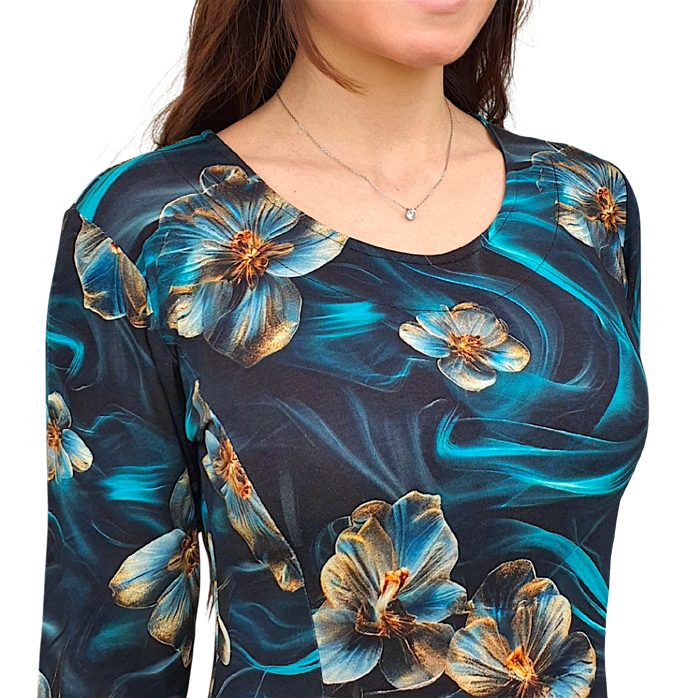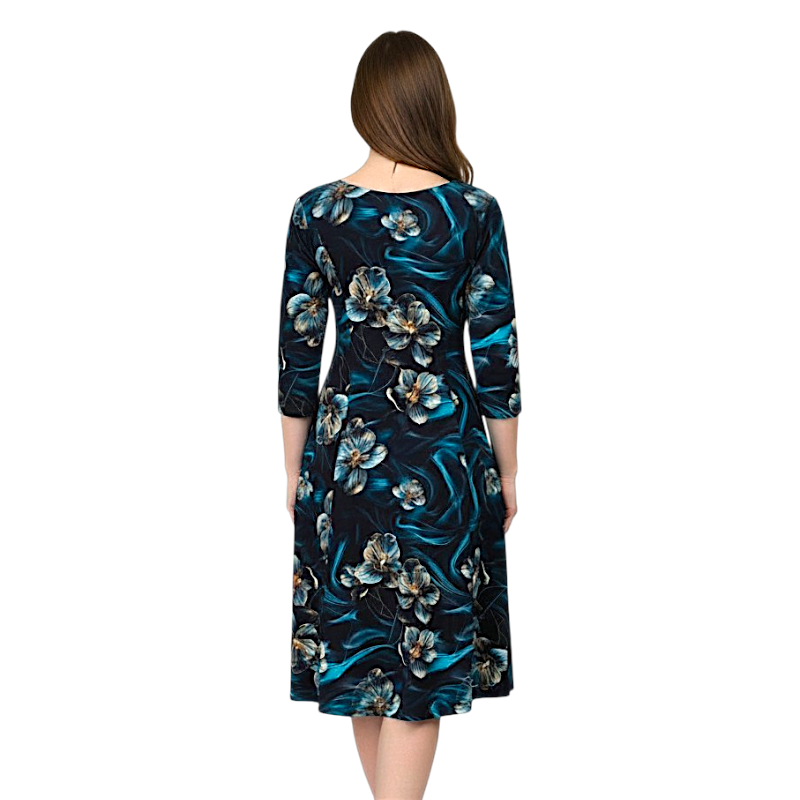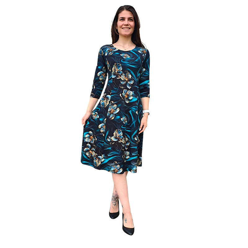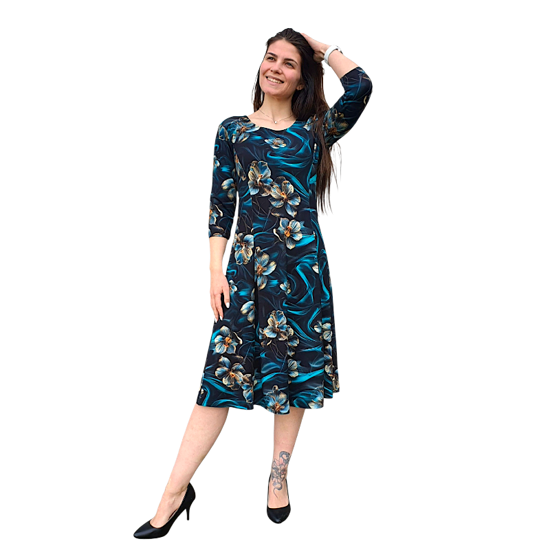 Елегантна рокля модел „Катя“ с 3/4 ръкав и дължина до коляното в стилен десен. Идеална за офиса, специален повод или изискано ежедневие.