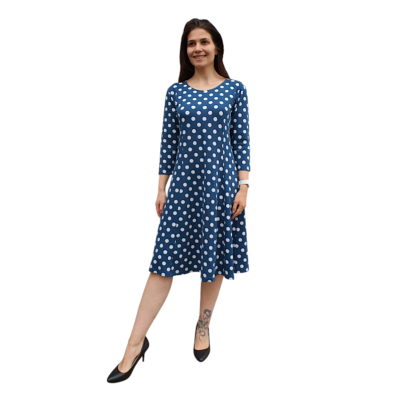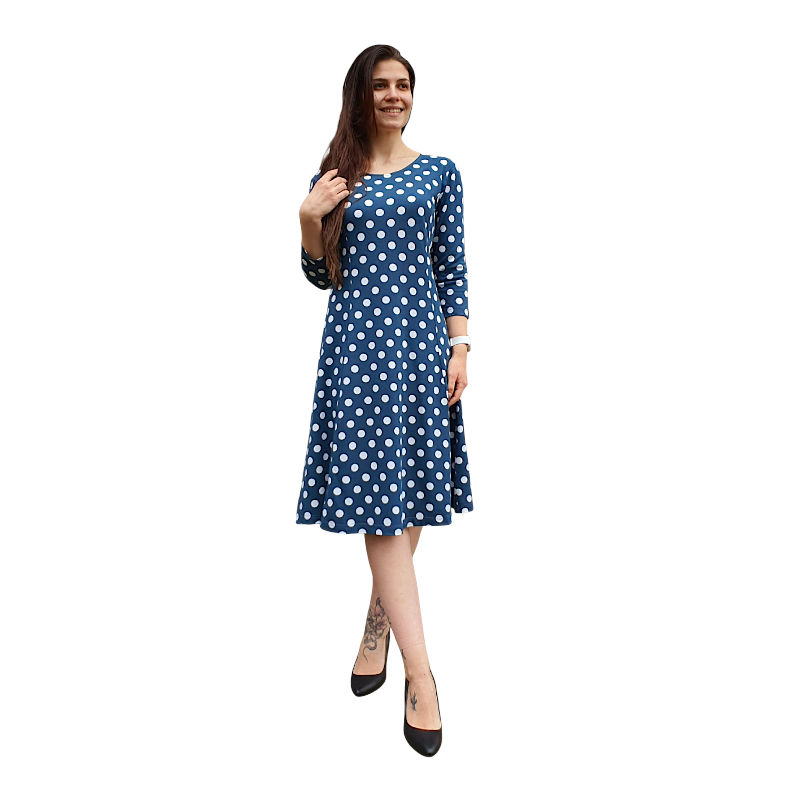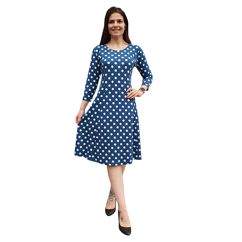 Елегантна рокля модел „Катя“ с 7/8 ръкав и дължина до коляното в интересен десен. Идеална за офиса, специален повод или просто за разходка.