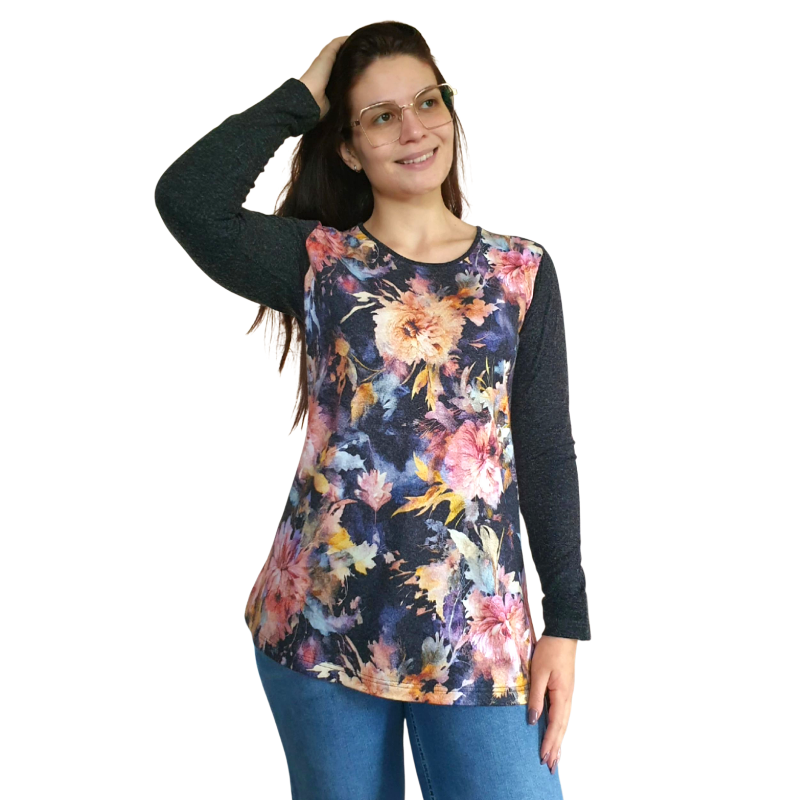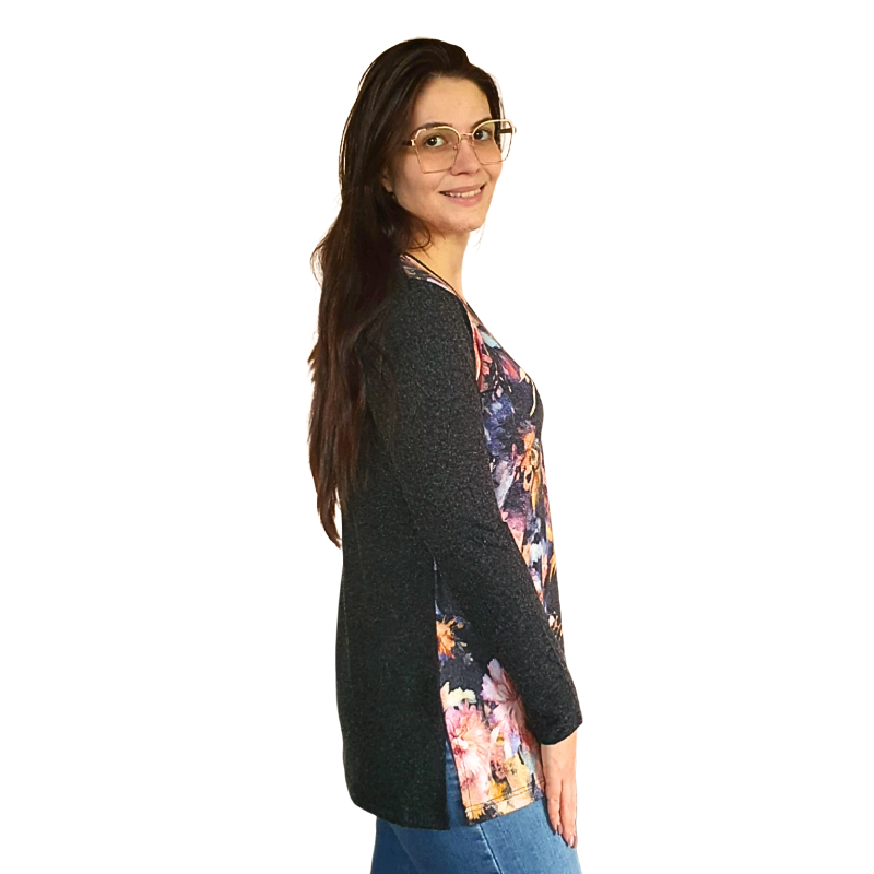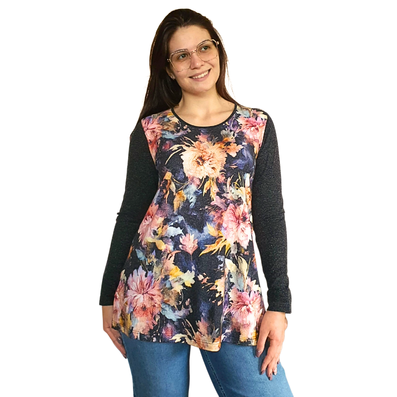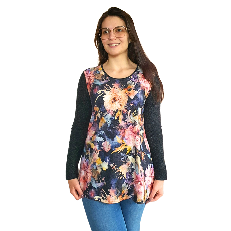 Туника “Ани” има класическа, трапецовидна кройка и цепки. Гърбът и ръкавите са от тъмно трико – което придава интересна визия.