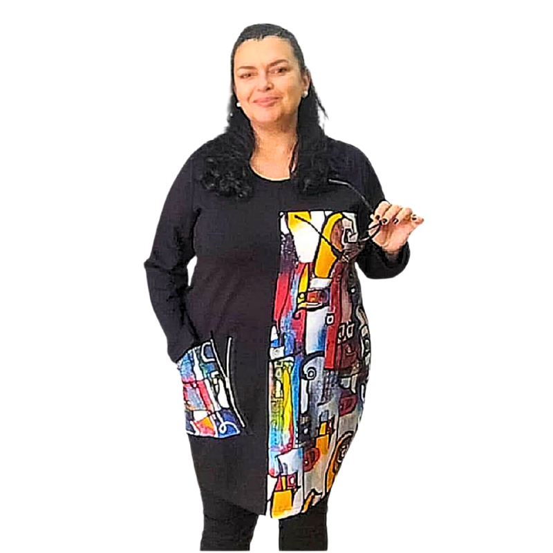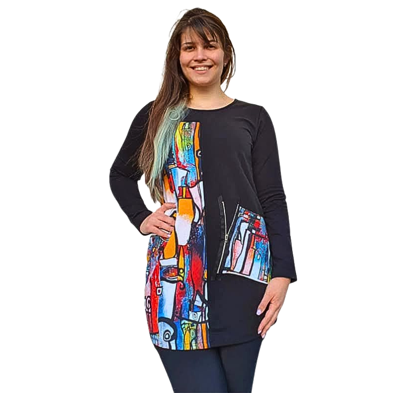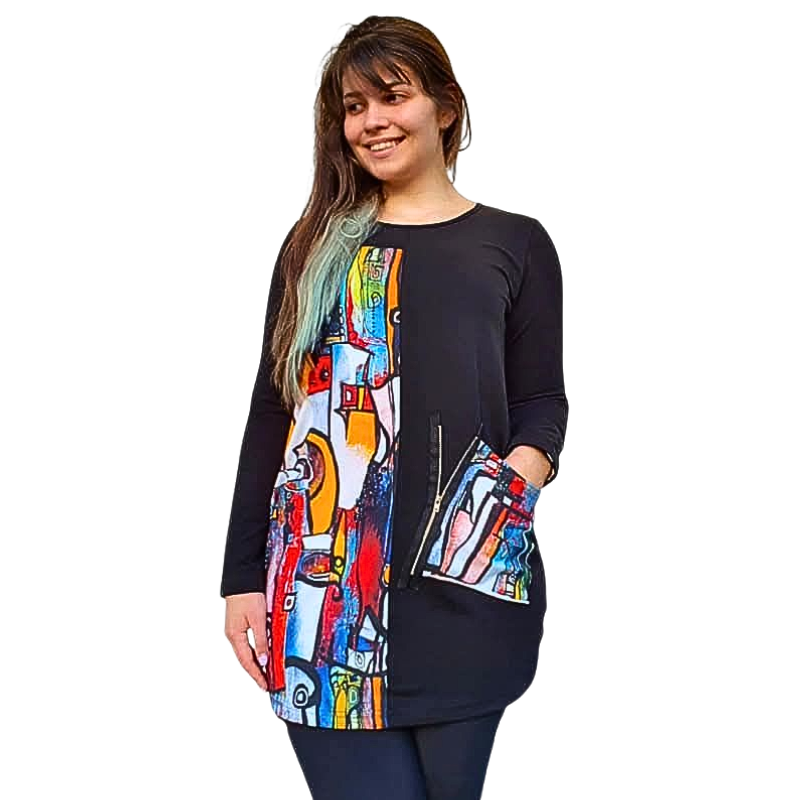 Елегантна туника с дълъг ръкав подходяща за всеки ден с декоративен джоб, в черен цвят с цветни мотиви. Комбинира се добре с клин и дънки. Есенна колекция.